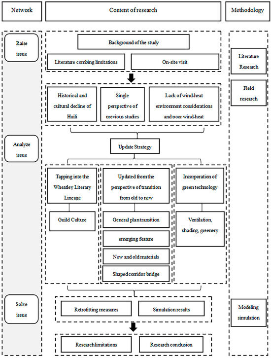 This study, in the context of the increasing urbanization process, through combing the above limitation points of previous studies and field surveys, has sorted out the key issues of this study from three aspects, which are summarized as the historical lineage, the perspective of the relationship between the old and the new, and the optimization of the green renewal simulation. We proposed our research strategy point by point in the three elements of “inheritance”, “renewal”, and “resettlement”, and we carried out specific and in-depth renewal design for each element. For the results of the renewal, we used Sware (20220401) and Glodon (HYBPA2024) software for modeling and simulation evaluation. This led to this paper’s conclusions, limitations, and future perspectives (Figure 1).