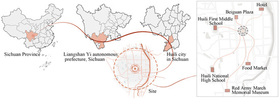 The case project is located in the ancient city of Huili in Liangshan Yi Autonomous Prefecture, Sichuan Province, which is at the crossroads of Sichuan and Yunnan and was a key fortress city in the ancient Southern Silk Road and the Tea and Horse Road (Figure 2). The base is located in the ancient city of Huili, adjacent to the center street of the ancient city. The east side of the ancient city is the riverfront modern commercial street area, and the base is now constructed as an antique commercial street. Through field research, the high density and chaotic planning in the antique street were found, and we observed that the construction materials were mostly concrete, imitation wood paint, etc., which is not conducive to sustainable development. After the field research, we found the existing problems of the base, and based on the above problems, we proposed a specific transformation strategy.