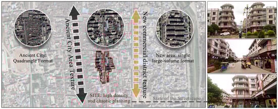 Based on the field research and literature analysis (Figure 3), this study concluded that three key issues need to be resolved: 1. the need to deal with the phenomenon of the gradual decline of the historical lineage of Huili; 2. from the mesoscopic point of view, the antique commercial district is located at the junction of the Gucheng Street and the emerging Riverside Commercial District, so how to effectively introduce the vitality of the new urban area to deal with the relationship between the old and the new, and to revitalize the old city is particularly important; 3. the antique district is mostly the later stage of the major demolition and reconstruction of buildings, resulting in high density and chaotic planning, leading to a poor wind and heat environment in this area, affecting the human thermal comfort experience and the living environment. At the same time, the buildings use concrete and wood-like color coatings, and the building energy consumption is large, which is not conducive to sustainable green development. Therefore, it is very important to carry out the transformation and simulation evaluation of the district using green design strategies, which is conducive to mitigating the urban heat island effect and the surrounding microclimate environment.