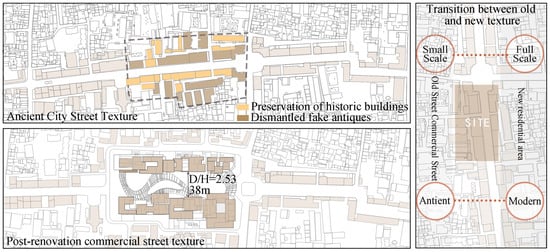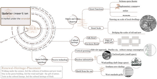 As shown in Figure 4, this study started from the three existing problems above; mainly focused on the framework of cultural heritage, old and new connections, and green building; and proposed the specific transformation strategies of “inheritance”, “renewal”, and “insertion” to promote the cultural and functional rejuvenation of the old city of Huili. The specific transformation strategies of “inheritance”, “renewal”, and “insertion” were proposed to promote the cultural and functional revitalization of the ancient city of Huili.