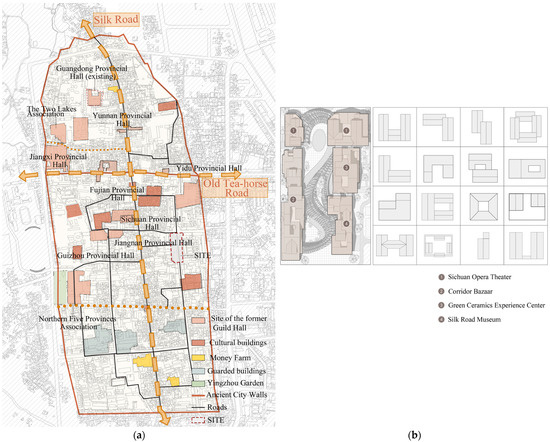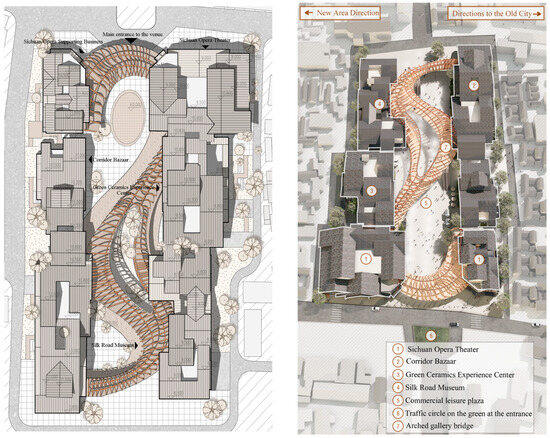 The base of the transformation project was surrounded by residential areas and commercial functions, so the use of functions should meet the cultural and tourism business to attract people flow at the same time to meet the needs of the daily activities of the surrounding residents, the formation of public activities as a link to the “activities + business” model, excavation of the local theater, local green ceramics, etc. The local drama, local green ceramics, and other local cultural characteristics of the commercial businesses make the traditional culture inherited in the commercial revitalization (Figure 8). The functions of the renovation project of the antique commercial street mainly include the Sichuan Opera Theater and ancillary businesses, a commercial bazaar, a green pottery workshop, and the Huili Folk Museum, and the overall function tends to be experiential. Considering the separation of static and dynamic flow and the frequency of human use, the first floor was set up for commercial supporting functions, while the second floor was set up for leisure experience functions such as exhibition halls and experience halls.