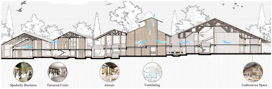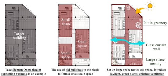 As for the nesting strategy of large and small spaces, taking the commercial building supporting Sichuan Opera as an example, this study used the old building of the base as a small space, integrated the small space part, and set a large space outside (Figure 7). In the large space, digging patios, implementing skylights, setting glass curtain walls, and placing green plants helped to introduce natural light into the large space box, realize natural ventilation, purify indoor microclimate, improve indoor environmental quality, reduce energy consumption of artificial lighting and air conditioning, and promote the sustainable renewal of the base. Regarding the heritage and social economy, the large and small space nesting strategy continues its historical and cultural value by integrating and optimizing the resource space of ancient buildings. At the same time, this measure will reduce energy consumption and improve the utilization of natural resources, which will help reduce the energy consumption of artificial lighting and air conditioning and reduce economic costs. Moreover, the quality of the interior environment was improved, enhancing the functionality and comfort of the building, thus attracting more users and promoting the development of the local economy.