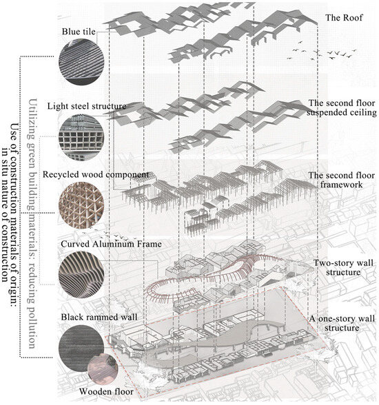 Considering the locality of the building materials and the concept of sustainable renewal, this project followed the unique green tile and white brick architectural style of western Sichuan. As shown in Figure 10, the eaves and the main structure of the building were made of aluminum and light steel structure, which reduced pollution and energy consumption in the construction process and promotes the sustainable renewal of the building; The roof of the house, specific components, and building walls were, respectively, made of green tiles, renewable wood, and black rammed earth materials. Although these materials are traditional materials, the local area is rich in such raw materials, reducing transportation and mining costs, as well as promoting sustainable economic development. At the same time, most of these traditional materials are recyclable materials, which have less pollution to the environment in production and also reflect the concept of ecological sustainable development.