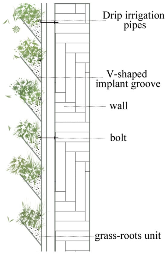 Regarding greening, Huili City is located in the subtropical monsoon climate zone where the average annual temperature is high, precipitation is mainly concentrated in summer, and winter is drier. We increased plant species that were drought-resistant, heat-resistant, cold-resistant, strongly light-resistant, and pest-resistant on the site, such as Liquidambar formosana and Ginkgo biloba. The lighting was regulated through the selection of vegetation to optimize the thermal environment of the site: providing good shade in summer to alleviate the hot and stuffy site environment and having the leaves fall in winter to increase the site’s lighting in winter and thus raise the temperature. At the same time, the board trough vertical greening detail (Figure 12) was adopted, in which the board trough served as a growth carrier for plants, and the drip irrigation system supplied plants with the necessary water and nutrients so that the plants formed a green barrier on the wall. We chose to plant evergreen vines such as Parthenocissus tricuspidata and Hedera helix to regulate the site’s microclimate through transpiration and improve air quality and air humidity.