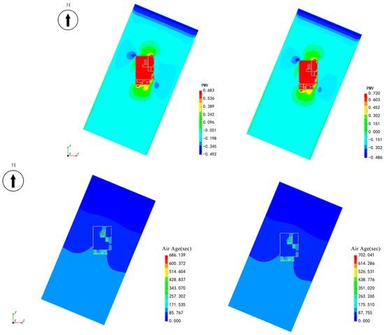 For thermal comfort assessment, both the Predicted Mean Vote (PMV) and air age index can be obtained. PMV is a metric that evaluates human comfort in a given thermal environment. This index is based on the basic equation of human body heat balance and the psychophysiological subjective thermal sensation level derived from the main examination of four environmental factors and two human factors on the impact of human thermal comfort. The “Moderate thermal environments—Determination of the PMV and PPD indices and specification of the conditions for thermal comfort” GB/T 18049-2000 states [40] that the PMV value ranges from −3 (cold) to +3 (hot), where 0 indicates moderate or comfortable. Evaluating the PMV, at Z = 1.5//Z = 1.0 m, the PMV was 0.00% of the area above 1, which was hot; 100.00% of the area between −1 and 1, which was comfortable; and 0.00% of the area below −1, which was cold. Evaluating the indoor air age, at Z = 1.5 m height, the air age was within 686.14 s, the air had no significant stagnation, the ventilation was good, and the indoor air was relatively fresh. At the height of Z = 1.0 m, the air age was within 702.04 s, the air had no obvious stagnation, the ventilation was good, and the indoor air was relatively fresh (Figure 15).