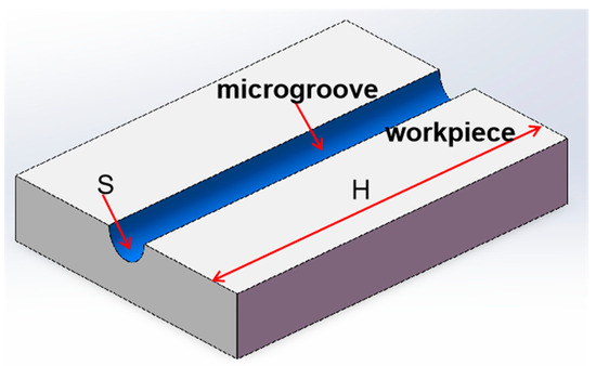 The experimental object is a 304L stainless steel workpiece. In order to reduce the mutual interference between grooves and grooves during the machining process and to facilitate the measurement, the initial length of the grooves was set to 5 mm, and the width to 0.5 mm, as shown in Figure 4a. For each group of single-factor experiments, five repetitions of experiments were conducted, and the average value was taken after counting the depth and width of microgrooves. Chance was reduced by randomly measuring multiple microgrooves.