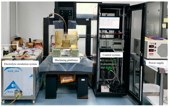 The experimental setup for jet electrolytic machining is shown in Figure 2. The setup mainly consists of a linear module, a servomotor-driven work feeder, and a worktable. The machine is fixed on a rigid marble base, which is designed to be vibration-resistant and has a low thermal conductivity and coefficient of thermal expansion. Adjustable damping pads have been added under the base to isolate the machine from environmental vibrations. The electromechanical control section incorporates Mitsubishi servo motors (Mitsubishi Electric Corporation, Tokyo, Japan), a Renishaw micro-encoder system (Renishaw plc, London, UK), and a motion control card from Shenzhen Raytheon (Leadshine Technology Co., Ltd., Shenzhen, China).
