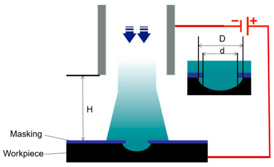 The material processing efficiency of jet electrolytic machining is related to the material removal rate, MRR, as shown in Figure 1, and the expression of the volume (Q) of the removed material in the processing time (t) is shown in Equation (1).