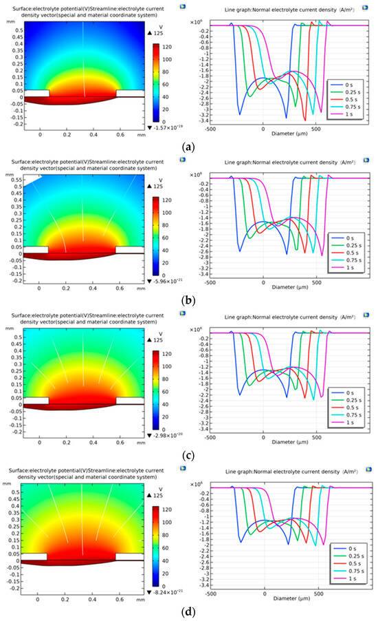 The pulse voltage is set to 50 V, 75 V, 100 V, and 125 V; the processing gap is 1 mm; and the processing time is 1 s. The electric field simulation model under different pulse voltages is established, and the electric field simulation analysis is carried out. In the analysis results, the corresponding electrolyte potential map and the current density line map for the 0.25 s time interval are selected, as shown in Figure 6.