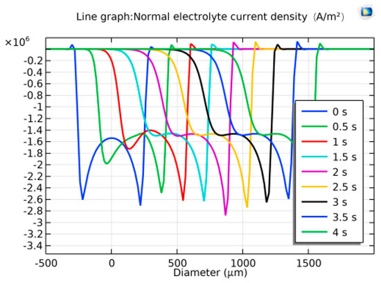 The processing time is set to 1 s, 2 s, 3 s, and 4 s; the processing voltage is 125 V; and the processing gap is 1 mm. The current density line graphs for the 0.5 s time interval are shown in Figure 8.