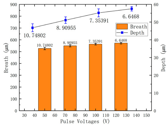 The average width and depth corresponding to the above pulse voltages were plotted as a relationship using Origin, as shown in Figure 9. The left vertical coordinate represents the width of the microgroove in the form of a bar graph, and the right vertical coordinate represents the depth of the microgroove in the form of a line graph.