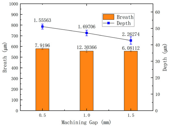 The widths and depths corresponding to the above machining gaps were plotted as a relationship graph using Origin, as shown in Figure 12. The left vertical coordinate represents the microgroove width in the form of a bar graph, and the right vertical coordinate represents the microgroove depth in the form of a line graph.