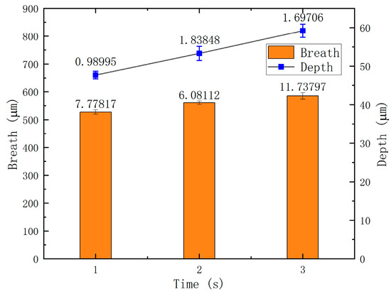 The average width and depth corresponding to the above machining times were plotted as a relationship using Origin, as shown in Figure 15. The left vertical coordinate represents the width of the microgroove in the form of a bar graph, and the right vertical coordinate represents the depth of the microgroove in the form of a line graph.