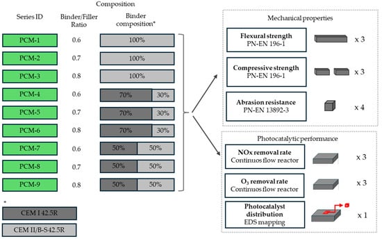 The research focused on evaluating the dependent variables, including the flexural and compressive strengths after 2 and 28 days of curing, the efficiency of ozone removal, the efficiency and selectivity of the photocatalytic decomposition of nitrogen oxides, and the abrasion resistance of the composites (Figure 1). Experimental data were utilized to determine the minimum required thickness of the photocatalytic mortar layer, recognizing that photocatalytic activity is confined to the surface-near region of the composite. This analysis incorporated abrasion resistance measurements to establish the layer’s durability. The calculated thickness provided a basis for assessing the carbon footprint per square meter of a pavement made of investigated composites, quantified in terms of CO2-equivalent emissions associated with the production of the composite constituents (e.g., cement, aggregates, fillers, nano-TiO2).