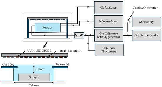 During testing, the prepared specimens were positioned within a sealed glass reaction chamber with a volume of 4 dm3, ensuring the photoactive surface was oriented toward the light source (Figure 2). A consistent gas flow rate of 2.0 L/min was maintained, with nitrogen oxide/ozone introduced at a concentration of 100 ± 5 ppb (NOx) and 110 ± 5 ppb (O3), and regulated using a multi-gas calibrator (pollutants were not introduced simultaneously into the system—separate test procedures for NOx and O3). The chamber conditions were carefully controlled, with a relative humidity of 40 ± 5% and a temperature of 20 ± 2 °C. The tests were conducted in an air environment.