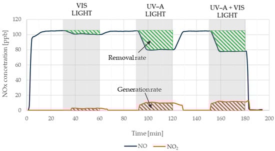 Each irradiation phase lasted 30 min, followed by 30 min intervals without any active light source. For each irradiation phase, the quantities of nitric oxide (NO) introduced into the reactor, NO removed by the photocatalytic sample, and nitrogen dioxide (NO2) generated during the photocatalytic process were quantified. Using these data, the rates of NOx removal and NO2 generation were calculated, expressed as the absolute reduction in or generation of NOx in micrograms per hour per square meter of the photocatalytic cementitious matrix (µg/hm2) under the various irradiation conditions. Additionally, the selectivity of NOx removal was determined using Equation (1), which incorporates the relative mass quantities of NO and NO2, as derived from the highlighted areas in Figure 3.