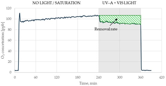 Due to the high reactivity of ozone, the test procedure for its photocatalytic removal was modified compared to the NOx test method. The test lasted for 6 h and was performed only for one irradiation condition (UV-a + visible) of irradiations at the same level as in the NOx test procedure—Figure 4. For the first four hours, irradiation sources were turned off, as the reactor with the sample inside was saturated with ozone. Once its concentration stabilized (i.e., its supply surpassed/equaled its consumption for various oxidation processes occurring inside the reactor/tubing, etc.), both UV-a and visible light LED light sources were turned on, and the following change in the O3 concentration was recorded. Using these data, the rate of O3 removal was calculated, expressed as the absolute reduction in O3 in micrograms per hour per square meter of the investigated mortar samples (µg/hm2). Ozone concentrations were measured via the Model T200 ozone analyzer (TELEDYNE API, San Diego, CA, USA). Ozone generation was performed using the CGM 2000 multigas calibrator (MCZ Umwelttechnik, Bad Nauheim, Germany). The calibration of ozone concentrations in the reactor was conducted with a reference photometer (MCZ Umwelttechnik, Bad Nauheim, Germany).