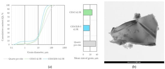 Figure 5. (a) Grain size distribution of binders and quartz powder used in the study; (b) TEM micrograph of a quartz filler grain (of regular/angular surface morphology). TEM analysis was performed on copper grids covered with a carbon film. (Microscope: TEM Tecnai TF 20 X-TWIN (FEI Company, Hillsboro, OR, USA). Parameters: EDAX; voltage, 200 kV; the STEM images were collected using the HAADF detector.)