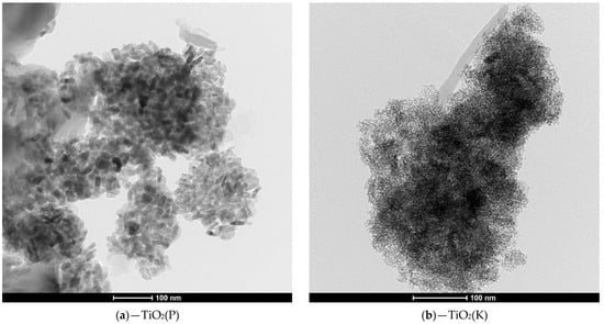Figure 6. TEM micrographs of nano-TiO2 photocatalytic materials (of regular/spherical surface morphology): (a) TiO2(P)—first-generation photocatalyst; (b) TiO2(K)—second-generation photocatalyst. TEM analysis was performed on copper grids covered with a carbon film. (Microscope: TEM Tecnai TF 20 X-TWIN. Parameters: EDAX; voltage, 200 kV; the STEM images were collected using the HAADF detector.)