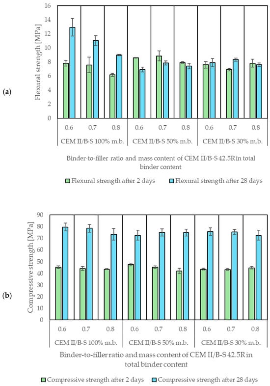 Figure 7. (a) Flexural strength. (b) Compressive strength of mortars investigated in the study after 2 and 28 days of curing as a function of the binder-to-filler ratio and percentage mass content of the CEM II/B-S 42.5R binder.