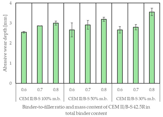 Figure 8. The abrasion wear depth of mortars investigated in the study calculated based on abrasion resistance tests conducted on the Bohme disk.