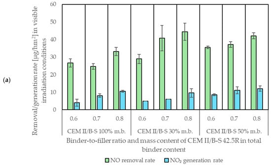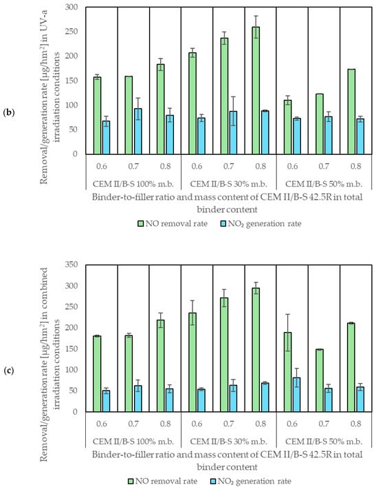 The photocatalytic efficiency for nitric oxide (NO) removal ranged from approx. 24 to 44 µg/hm2 under visible light (VIS)—Figure 9a, 110 to 260 µg/hm2 under UV-a light—Figure 9b, and 150 to 270 µg/hm2 when both light sources were active—Figure 9c. Both the binder composition and its overall mass content in the composite had a statistically significant influence over the NO removal rate in visible light conditions—while an increase in the CEM II/B-S content led to a decrease in the removal rate (ANOVA p = 0.01 < 0.05), the increase in the total binder mass contributed to its increase (ANOVA p = 0.03 < 0.05). The same dependence was found in the case of UV-a irradiation conditions (ANOVA p = 0.00 << 0.05 for CEM II content; p = 0.001 << 0.05 for the binder-to-filler ratio) and combined light sources (ANOVA p = 0.00 << 0.05 for CEM II content, and p = 0.049 < 0.05 for the binder-to-filler ratio).