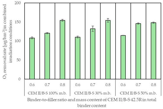The photocatalytic efficiency for ozone (O3) removal ranged from approx. 108 to 155 µg/hm2 under combined light sources—Figure 10. Under combined irradiation, a strong statistically significant effect of an increase in the binder-to-filler ratio on the increase in ozone removal was found (ANOVA p = 0.008 << 0.05).