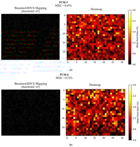 Figure 11. Binarized EDS mappings and corresponding heatmaps illustrating the TiO2 distribution on the photoactive surfaces of (a) the PCM-3 sample and (b) the PCM-6 sample (Abbreviations: MtiC—Mean TiO2 coverage).