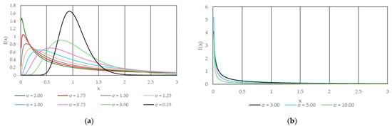 Figure 12. Probability density distribution for the log-normal distribution of σ-values in a range adopted in the study, (a)—for σ-values between 0.25 and 2.00; (b)—for σ-values between 3.00 and 10.00.