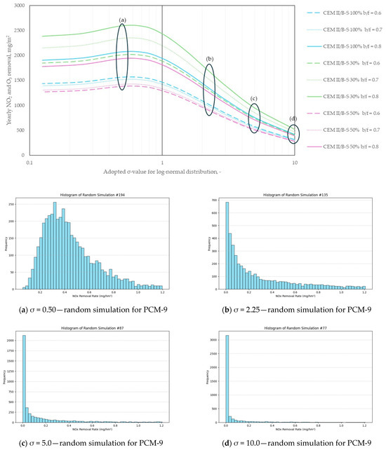 Numerous environmental factors have been demonstrated to significantly influence the photocatalytic performance of cementitious composites. These factors include, but are not limited to, variations in irradiation characteristics (e.g., intensity, wavelength, and duration of sunlight exposure), air flow parameters, humidity, temperature, and the presence of competing chemical species in the environment [58,59,60,61]. To account for the complex and interdependent effects of these variables in the conducted simulation, a log-normal distribution was applied to model their influence on the pollutant removal rate. This approach reflected the inherent variability and stochastic nature of environmental processes, allowing for a more realistic representation of photocatalytic activity under real-world conditions. Log-normal distributions are widely observed across a broad spectrum of scientific disciplines, particularly within environmental sciences, describing multiplicative interactions of numerous independent variables. Examples include the distribution of aerosols, heavy metals, organic pollutants, minerals, trace gases, inorganic ions, or microplastics in a range of environmental matrices, such as groundwater, urban and indoor air, precipitation, stormwater, soils, wastewater, landfills, and others [62].
