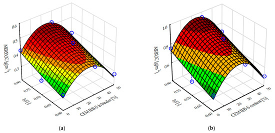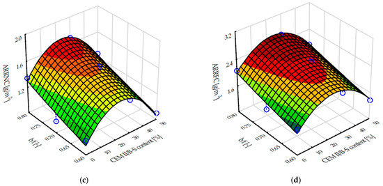 The flexural strength of the composites after a 28-day curing period was found to range between 6.98 MPa and 14.63 MPa (Figure 7a). Both the binder composition and its overall mass content in the composite had a statistically significant influence over the investigated property—while an increase in the CEM II/B-S content led to an increase in the flexural strength (ANOVA p = 0.00 << 0.05), the increase in total binder mass contributed to its decrease (ANOVA p = 0.047 < 0.05).