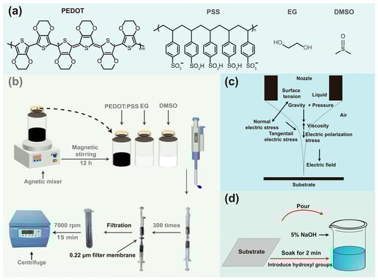 Materials: PEDOT:PSS (PH1000, Shanghai, China, Sigma-Aldrich, Trading Co., Ltd.), dimethyl sulfoxide (DMSO, Shanghai, China, Sigma-Aldrich, Trading Co., Ltd.), ethylene glycol (EG, Shanghai, China, Sigma-Aldrich, Trading Co., Ltd.), and sodium hydroxide (NaOH, Shanghai, China, Vita, Trading Co., Ltd.) were directly used, without any purification. Stainless steel nozzle (100 μm, Guangdong, China, Lanbowan, Smart Dispensing Technology Co., Ltd.) and filter membrane (0.22 μm, Tianjin, China, Keyilon Experimental Equipment Co., Ltd.).