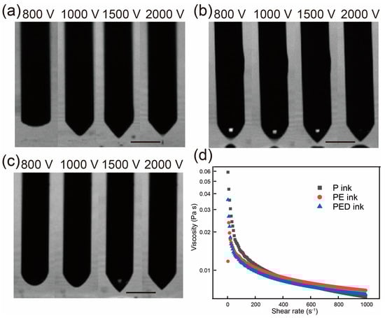 The effect of the increasing voltage on the Taylor cone: (a) The shape change of the Taylor cone for the P ink with increasing voltage. (b) The shape change of the Taylor cone for the PE ink with increasing voltage. (c) The shape change of the Taylor cone for the PED ink with increasing voltage. (d) The rheological properties of the inks. Scale bar: 0.25 mm.