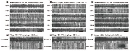 We also recorded the changes in the shape of printed lines for the three inks as the voltage increased, with the working distance and printing speed remaining constant. As shown in Figure 3, an insufficient voltage during printing may cause inaccurate droplet deposition, leading to irregular printed segments. Additionally, it can cause instability in the ink ejection, resulting in discontinuous printed lines. When the voltage is set too high, the excessive voltage during the electrohydrodynamic jet printing process can dramatically increase the electric field force, generating a strong ejection force. This can not only disperse the ink ejection too much, increasing the production of satellite droplets, but also make it difficult to control the size of the droplets, affecting the uniformity and edge clarity of the lines. Therefore, to ensure the quality and precision of the printed segments, it is essential to carefully control and optimize the voltage parameters to balance the electric field force and the physical properties of the ink, achieving precise droplet deposition. As shown in Figure 3a–c, the P and PED inks printed relatively uniform lines between 1400 V and 1600 V, while the PE ink printed uniform lines between 1200 V and 1400 V.