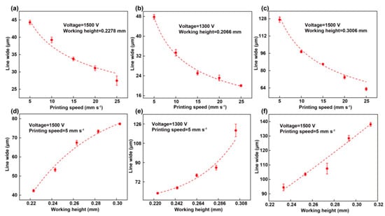 The effect of printing speed and printing height on the line width: (a–c) Changes in the line width with the increasing printing speed. (a) P ink. (b) PE ink. (c) PED ink. (d–f) Changes in the line width with the increasing working distance. (d) P ink. (e) PE ink. (f) PED ink.