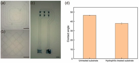 We used the prepared PE ink as the printing solution to print conductive polymer patterns and devices on the treated filament membrane substrates. The stainless steel needle had an inner diameter of 100 μm and an outer diameter of 250 μm, with a working voltage of 1300 V, a motion platform speed of 10 mm/s, and a printing height of 0.2 mm to 0.3 mm. As shown in Figure 5a–c, under these parameter ranges, the line width of the printed PEDOT:PSS conductive polymer was between 20 and 90 μm, and the resolution of the processed conductive polymer patch was also as high as 1.5 cm × 0.5 cm. The conductivity of the printed conductive polymer was approximately 121.5834 S/cm. Compared to most PEDOT:PSS inks that are currently suitable for electrohydrodynamic jet printing, our developed PE ink significantly improves the precision of the EHD jet printing of PEDOT:PSS organic conductive polymers. Therefore, optimizing the PEDOT:PSS ink formulation plays a significant role in enhancing printing accuracy and resolution. At the same time, we compared the contact angles of the PE ink on untreated substrates and substrates treated with 2% NaOH for hydrophilization. On the hydrophilized substrates, the contact angle of the PE ink significantly decreased, indicating that the surface energy of the substrates was significantly increased, enhancing their wettability. This means that the ink can wet and adhere better on the hydrophilized substrates, thereby improving the dispersion and uniformity of the ink on the substrate. This improved surface property helps enhance the ink deposition effect, further optimizing the printing quality (Figure 5d).