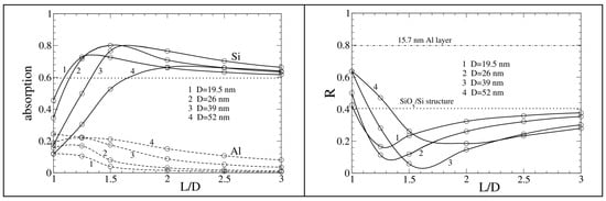 Our method allowed us to calculate the absorption in the layer and the Si layer separately. Since is transparent, the absorption in the layer is simply the absorption on Al nanoparticles. The absorption in the Si layer has a practical importance for applications in solar cells. The larger the fraction of the incident light absorbed in Si, the higher the efficiency of a silicon solar cell covered by the layer. Hence, we are looking for optimal parameters, which maximise the absorption in the Si layer. The relevant parameters considered here are the nanoparticle diameter , the distance between the centres of the neighbouring nanoparticles, and the distance between the interface and the bottom of a nanoparticle. Moreover, the results essentially depend on the ratio . The results depending on and are presented in Figure 3, where the absorption both in the Si layer and on Al nanoparticles (left), as well as the reflection from the whole structure (right), are shown, comparing these absorption and reflection values with those for a pure structure without the Al nanoparticles (dotted lines). We set in this calculation series. According to these results, the diameters and with around 1.5 (for ) or 1.7 (for ) appear to be nearly optimal for the wavelength , making it possible to increase the absorption in the Si layer from ≈0.6 to ≈0.8 by adding the Al nanoparticles in the top layer. Some absorption on the Al nanoparticles also takes place (dashed lines). However, this is accompanied by a decrease in the total reflection from the structure (Figure 3, right), resulting in a larger absorption in the underlying Si layer at a good choice of and . This is known as the plasmon resonance effect [2,5,20,33]. We compared the R values with that of a structure with a continuous thick Al layer (as in our real samples) between the and Si layers instead of the Al nanoparticles (the dot-dashed line in Figure 3, right). This comparison shows an undesirably large reflection (about ) from the structure with a continuous Al layer.