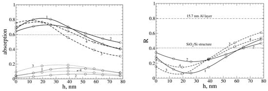 The absorption in the Si layer (solid curves, left) and on Al nanoparticles (dashed curves, left), and the reflection coefficient (right) depending on at (1), (2), (3), and (4), calculated for the structure with Al nanoparticles at the wavelength . The absorption and reflection for the same structure without the Al nanoparticles are indicated by horizontal dotted lines, whereas the value of for the system with a continuous thick Al layer between the and Si layers is indicated by the dot-dashed line.