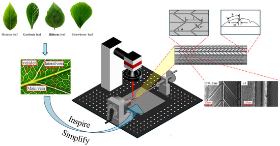 One branch of fractal theory is fractal graphics, which concerns itself with the local properties of a system or structure, as well as the similarity between local structures and the overall structural properties. This is the concept of self-similarity, as it applies to fractal structures. Such self-similarity is evident in the natural world, as exemplified by plants and trees. The structure of the branches is analogous to the overall structure of the trunk, and the branching structure of the branches is also analogous to the overall structure of the trunk. This self-similarity can be extended to structures such as tree roots, branches, leaf veins, etc. (see Figure 2a), exemplified by a snowflake derived from the Von Koch self-similarity fractal curve [36]. The secondary fractal structure that forms the basis of this study was inspired by the intricate patterns observed in leaf veins. As a type of fractal structure, the leaf-vein structure is selected for analysis on the basis of its symmetrical lateral veins, as illustrated in Figure 2b. In this study, the primary main groove is identified as the main vein of the leaf vein, while the secondary lateral groove is identified as corresponding to the lateral vein [37]. As a consequence of the constraints imposed by the processing difficulty, the design of a third-order groove was not feasible. Consequently, the topological model was simplified to a secondary fractal structure. The two-level classification composite-structure model is illustrated in Figure 1. The distance between the main grooves of the first level is designated as S, the width of the main groove is represented by D, and the width of the V-groove on the side of the second level is represented by d. Due to the relatively small size of d, the influence of factors such as scanning times and scanning paths on the drag-reduction performance is not considered separately in laser machining; instead, it is considered together with the main groove of the primary plane. Therefore, λ is set as the width ratio of the first-level main groove to the second-level side groove, i.e., λ = d/D. The angle between the first-level main groove and the V-shaped groove on the second-level side groove is α, and the distance between adjacent second-level side grooves is L.