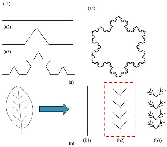 Self-similar fractal structure: (a1–a4) snowflake fractal structure based on the Von Koch curve; (b1–b3) self-similar fractal leaf-vein structure.