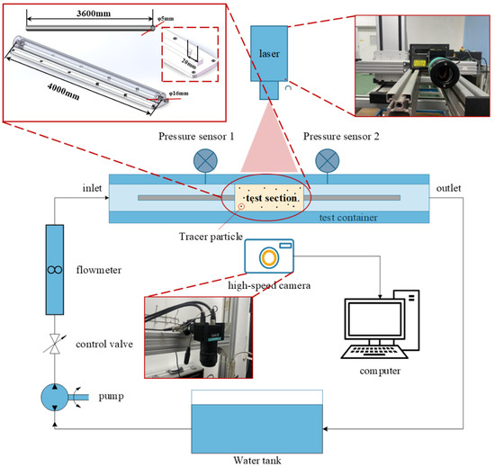 The objective of this study is to examine the drag-reduction capabilities of a secondary fractal composite structure on the surface of stainless-steel bodies of revolution. A device for evaluating drag-reduction performance was designed, and the PIV (Particle Image Velocimetry) method was employed for the assessment of the fluid flow field. The transparent channel was selected for use in the experimental test section of the device, as this facilitates the tracking of particles and the acquisition of images, as illustrated in Figure 5. The test channel is comprised of three primary components: an upper cover plate, a lower bottom plate, and a gasket. The upper cover plate is manufactured from transparent acrylic (PMMA polymethyl methacrylate) and is cylindrical in shape. The lower bottom plate is constructed from aluminium alloy, as are the Y-shaped components on either side of the bottom plate. The gasket material is silicone. In order to utilise the same watershed for experimental testing and numerical simulation, while accounting for the influence of the wall surface on the experimental measurement outcomes, the internal configuration of the test channel has been designed as a hollow cylindrical structure, with a diameter of 16 mm for the hollow watershed. In order to prevent the occurrence of unstable water flow and stress concentration at the inlet, the inlet of the flow field is configured to represent a fully developed flow. In practical drag-reduction testing, it is also essential to consider the stability of the water flow in the vicinity of the inlet and outlet. As the water flows through the pipe and the inlet and outlet in the channel, there are notable alterations in its flow state and channel cross-section. In order to guarantee a sufficient and stable flow in the test section, the inlet and outlet are positioned at each end of the drag-reduction channel, at a distance of 400 mm. Two apertures, with a diameter of 9.5 mm and a G-thread, are located at the inlet and outlet. The aforementioned components are connected to plastic hoses via metal connectors, thus facilitating the transport of the fluid. Two Y-shaped support brackets are affixed to the base plate for the purpose of providing support and securing the stainless-steel rod throughout the course of the test. The fundamental principle of PIV technology is the introduction of minute tracer particles into the fluid, which must exhibit excellent followability within the fluid. The laser chip light source is capable of illuminating the tracer particles within the watershed, which can then be observed by a high-speed camera in order to obtain a motion image of the tracer particles. By utilising cross-correlation algorithms and image processing techniques, the instantaneous velocity of each point within the watershed can be calculated based on the distance of particle movement between two frames, one preceding and one following the observation. Subsequently, the flow field characteristics are analysed through the utilisation of velocity vector diagrams. Figure 6 provides a schematic representation of the PIV testing device.