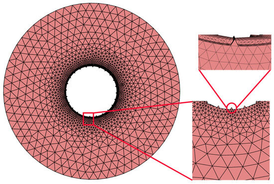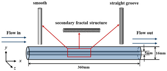 Numerical simulation employs the identical flume utilized in the experimental test section. This flume features an internal hollow diameter of 16 mm and a stainless-steel rod diameter of 5 mm, collectively forming a circular flow channel, as illustrated in Figure 6. In the simulation calculation process, to circumvent the potential for unstable water flow and stress concentration at the inlet, the inlet of the flow field is set to a fully developed flow, and the wall is designated as a non-slip wall. The velocities in the y and z directions are represented by u, v, and w, respectively. The fluid flows along the x-axis at a velocity of u, with a total length of 360 mm. The simulation employs a three-dimensional steady-state approach, with the direction of flow aligned along the x-axis. The inlet employs velocity inlet boundary conditions, with disparate operating conditions regulated by varying the Reynolds number. The outlet is configured with pressure outlet boundary conditions, with the pressure set to zero. A pressure-based solver is employed to solve the momentum equation using the SIMPLE algorithm, which utilises a second-order upwind scheme.