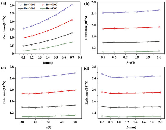 As illustrated in Figure 9a, the surface of the equal-diameter body of revolution is characterised by straight grooves, and the trend of resistance distribution is analogous to that observed in the secondary fractal composite structure. For a given Reynolds number, an increase in groove width results in a proportional increase in resistance. Conversely, for a fixed groove width, an increase in Reynolds number leads to an increase in resistance. However, the rate of increase in resistance for straight grooves is less pronounced than that observed for the secondary fractal structure. At a Reynolds number of 7000, the maximum resistance is lower than that observed for the secondary fractal structure.