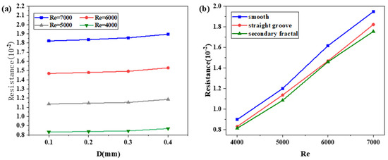 Straight groove resistance situation: (a) different-D single-straight-groove resistance; (b) surface drag resistance of three structures with different Reynolds numbers.