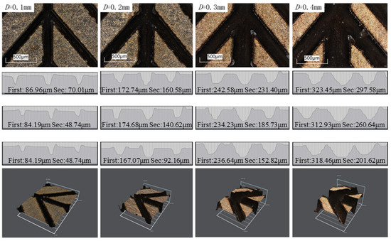 As illustrated in Figure 10, the surface morphology of V-shaped grooves processed via three distinct scanning paths was observed. It can be observed that when the side length D of the primary main grooves is 0.1 mm, utilising the second scanning path scheme results in the depth of the second-level lateral groove being approximately 0.5 times the depth of the primary main grooves. When D equals 0.2 mm, 0.3 mm, and 0.4 mm, the third scanning path scheme allows for the depth of the secondary lateral groove to be approximately 0.5 times the depth of the primary main groove. From a depth perspective, although the ratio of the depth of the V-shaped groove of the secondary lateral vein to that of the V-shaped groove of the primary main groove is slightly greater than 0.5 with the increase in the width of the primary main groove, it is not completely equal. However, reducing the number of grooves in each layer too much cannot guarantee the smoothness of the V-shaped groove slope. Therefore, the method of reducing more scanning lines was not selected.