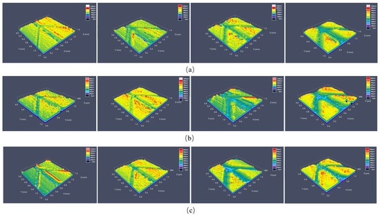Figure 11a–c demonstrate the three-dimensional morphology of the secondary fractal structure surface of the stainless-steel body of revolution under a laser confocal microscope at 10, 15, and 20 laser marking times, respectively. The vivid colour contrast facilitates a more intuitive comprehension of the relationship between the processing depth of the stainless-steel rod surface and the number of marking times.