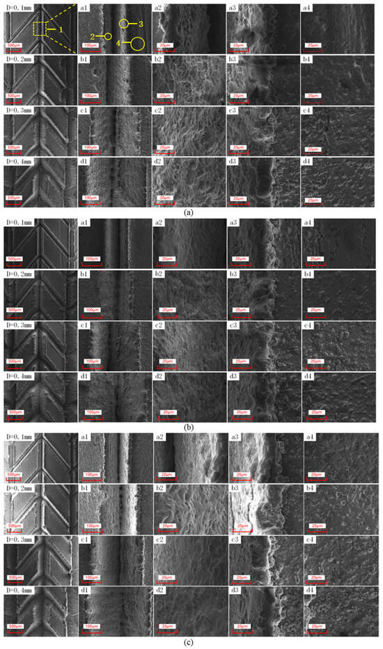 In order to investigate the morphology of the V-shaped groove edge and the flatness of the tapered surface of the groove, various regions of the test specimen were characterised and analysed using an electron scanning microscope. As shown in Figure 12a, area 1 represents the overall situation of the primary main vein groove; area 2 represents the inclined surface area of the groove, where the edge of the groove has accumulated molten metal due to laser processing; area 3 is the molten area; area 4 is the unstructured area on both sides of the groove. Figure 12a shows the surface morphology of the V-shaped grooves on the surface of the stainless-steel body of revolution after scanning 10 times, with side lengths of D = 0.1 mm, D = 0.2 mm, D = 0.3 mm, and D = 0.4 mm in area 1–4 under scanning electron microscopy at different magnifications. It can be seen that the amount and size of the surface melt at D = 0.1 mm, D = 0.2 mm, D = 0.3 mm, and D = 0.4 mm are not significantly different from the total size. The amount of surface melt increases with the size of the V-shaped groove. The continuity of the groove slope surface is relatively good, and a small number of traces of the scanning path can be seen. Figure 12b shows the surface morphology of area 1–4 at different magnifications under a scanning electron microscope for the V-shaped grooves on the surface of a stainless-steel body of revolution with laser scanning times of 15, side lengths of D = 0.1 mm, D = 0.2 mm, D = 0.3 mm, and D = 0.4 mm, respectively. It can be seen that the distribution of the surface melt is basically similar for D = 0.1 mm, D = 0.2 mm, D = 0.3 mm, and D = 0.4 mm, but the distribution pattern of the melt spatter on both sides of the groove is different. At D = 0.1 mm, there is almost no melt splatter on the surface. As the size of the V-groove increases, the amount of molten spatter increases significantly. The V-groove has good continuity in its inclined surface morphology, and the overall surface is smooth and flat. Figure 12c shows the surface morphology of area 1–4 under scanning electron microscopy at different magnifications for V-shaped grooves with side lengths of D = 0.1 mm, D = 0.2 mm, D = 0.3 mm, and D = 0.4 mm on the surface of a stainless-steel body of revolution after 20 laser scans. It can be seen that, at the same scanning frequency, the surface molten material with D = 0.1 mm, D = 0.2 mm, D = 0.3 mm, and D = 0.4 mm increases with the increase in the size of the V-shaped groove (the larger the size, the more repeated the scanning path). The number and size of melt splashes on the unstructured surfaces on both sides also increase with the size of the V-groove, but the overall difference is not significant. The internal slope morphology of the V-groove has good continuity, and there are no defects.
