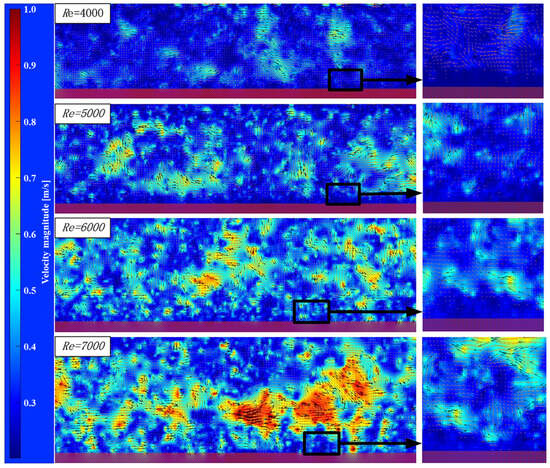 Figure 13 shows the velocity vector diagram of the secondary fractal structure stainless-steel body of revolution at different Reynolds numbers when D = 0.1 mm. It can be clearly seen that at Re = 4000 there are small vortices and turbulent spots in the watershed. As the Reynolds number increases, the number of small eddies in the watershed increases, and the velocity vector cloud map shows that the velocities of the eddies and turbulent spots increase accordingly. By observing the turbulent boundary layer on the surface of the simulated leaf-vein structure at different Reynolds numbers, it was found that Re was in the range of 4000~7000. The experimentally obtained turbulent boundary layer was basically consistent with the theoretical turbulent boundary layer. Near the surface of the secondary fractal structure, there was a laminar bottom layer, and the watershed was filled with small eddies and turbulent spots.