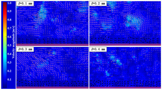 Figure 14 shows the velocity vector diagrams of the secondary fractal stainless-steel body of revolution at D = 0.1 mm, D = 0.2 mm, D = 0.3 mm, and D = 0.4 mm for the same Reynolds number. It can be seen that vortices and turbulence patches are present in all four sets of velocity vector diagrams in the watershed but show differences at the turbulent boundary layer. When the width of the first-level main channel is D = 0.1 mm, the turbulent boundary layer corresponds to the theoretical turbulent boundary layer consisting of a laminar bottom layer, small vortices and turbulent spots. However, at D = 0.2 mm there is a small amount of disturbance in the laminar boundary layer. As the width of the first-level main groove D increases, the disturbance gradually increases until D = 0.4 mm, when the disturbance in the laminar bottom layer becomes small eddies. The disturbance in the lower layer of the laminar flow increases with the increase in the first main groove edge length, D. The experimental results are in good agreement with the numerical simulation results. This increase in disturbance causes an increase in wall shear force and flow resistance. In addition, from the experimental results, it can be seen that only when D = 0.1 mm, the laminar bottom layer shows stable performance with almost no disturbance phenomenon.
