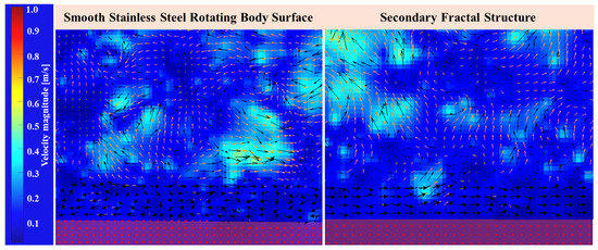 Comparing the velocity vector diagrams of the smooth stainless-steel body of revolution and the processed stainless-steel body of revolution with a secondary fractal structure. As shown in Figure 15, the laminar bottom layer was enlarged and marked. It was found that the laminar bottom layer on the surface of the stainless-steel body of revolution with a secondary fractal structure tended to be stable, and there were a few small vortices present in the laminar bottom layer on the surface of the smooth stainless-steel body of revolution. Compared with the laminar bottom layer on the surface of the stainless-steel body of revolution with a secondary fractal structure, the latter has better stability in the laminar bottom layer, and the velocity in the laminar bottom layer is slightly higher than that on the smooth surface; that is, the primary main groove causes high-speed bands to appear near the wall of the stainless-steel body of revolution. There are a small number of vortices in the laminar bottom layer on the surface of the smooth stainless-steel body of revolution, which causes the wall shear force to be greater than that of the secondary fractal structure surface, and the surface resistance is greater than that of the secondary fractal structure, thus reflecting the drag-reduction function of the secondary fractal structure.